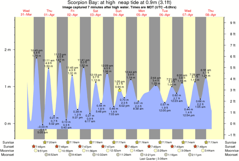Image captured 7 minutes after high water (at high neap tide). Tide height was 0.9m (3.1 ft). Range 2.76m (9.1 ft). Toggle tide graph