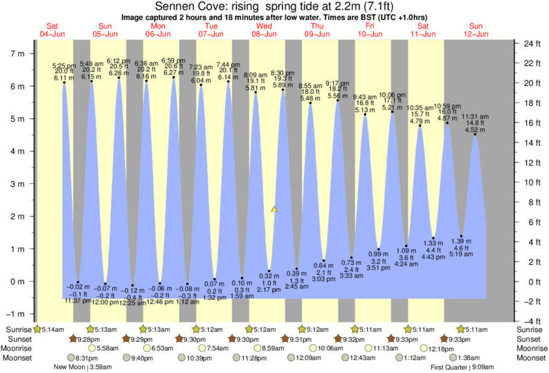 Image captured 2 hours and 18 minutes after low water (rising spring tide). Tide height was 2.2m (7.1 ft). Range 7.23m (23.7 ft). Toggle tide graph