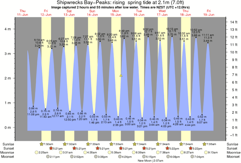 Image captured 2 hours and 55 minutes after low water (rising spring tide). Tide height was 2.1m (7.0 ft). Range 4.19m (13.7 ft). Toggle tide graph