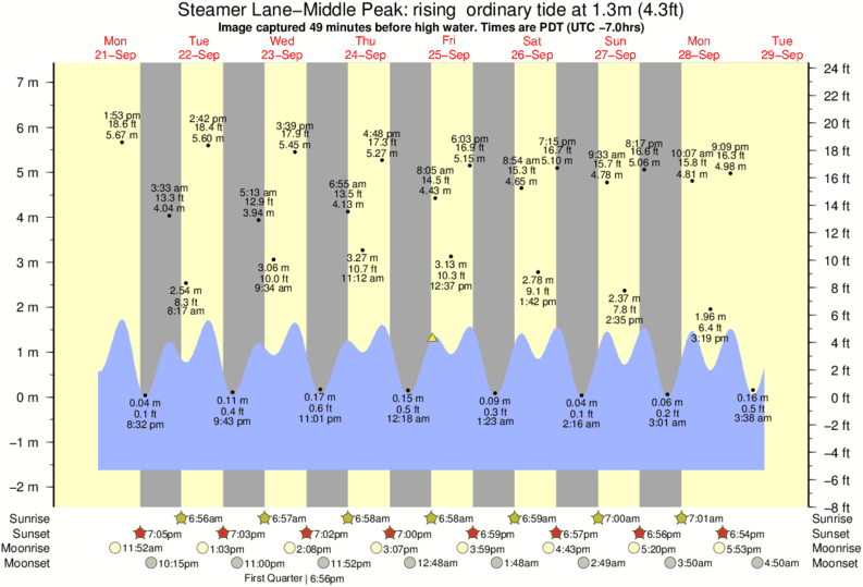 Image captured 49 minutes before high water (rising ordinary tide). Tide height was 1.3m (4.3 ft). Range 8.24m (27.0 ft). Toggle tide graph