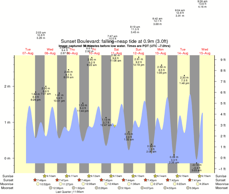 Image captured 56 minutes before low water (falling neap tide). Tide height was 0.9m (3.0 ft). Range 2.73m (9.0 ft). Toggle tide graph