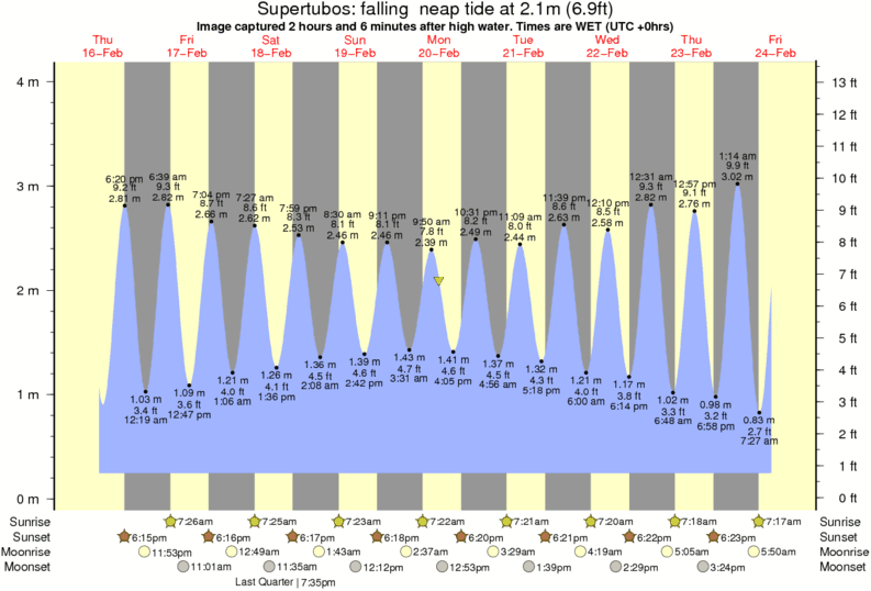 Image captured 2 hours and 6 minutes after high water (falling neap tide). Tide height was 2.1m (6.9 ft). Range 3.58m (11.7 ft). Toggle tide graph