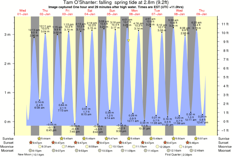 Image captured One hour and 29 minutes after high water (falling spring tide). Tide height was 2.8m (9.2 ft). Range 3.42m (11.2 ft). Toggle tide graph