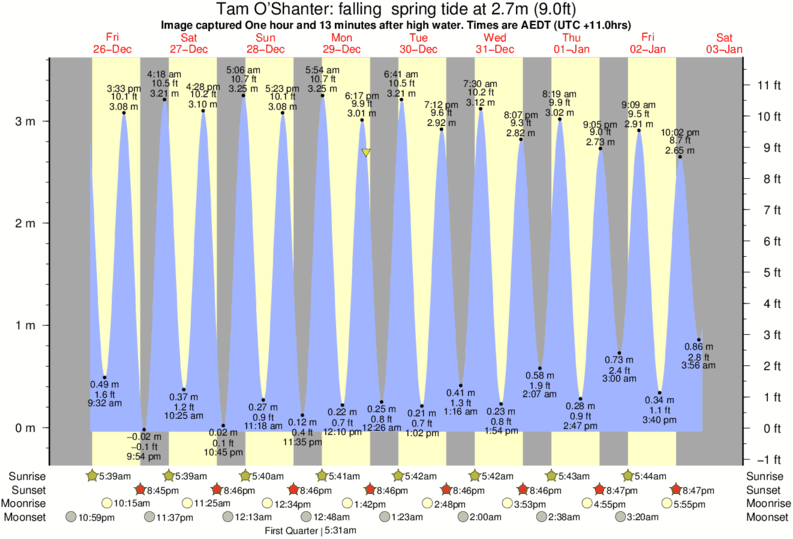 Image captured One hour and 13 minutes after high water (falling spring tide). Tide height was 2.7m (9.0 ft). Range 3.33m (10.9 ft). Toggle tide graph