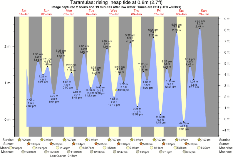 Image captured 2 hours and 19 minutes after low water (rising neap tide). Tide height was 0.8m (2.7 ft). Range 2.74m (9.0 ft). Toggle tide graph