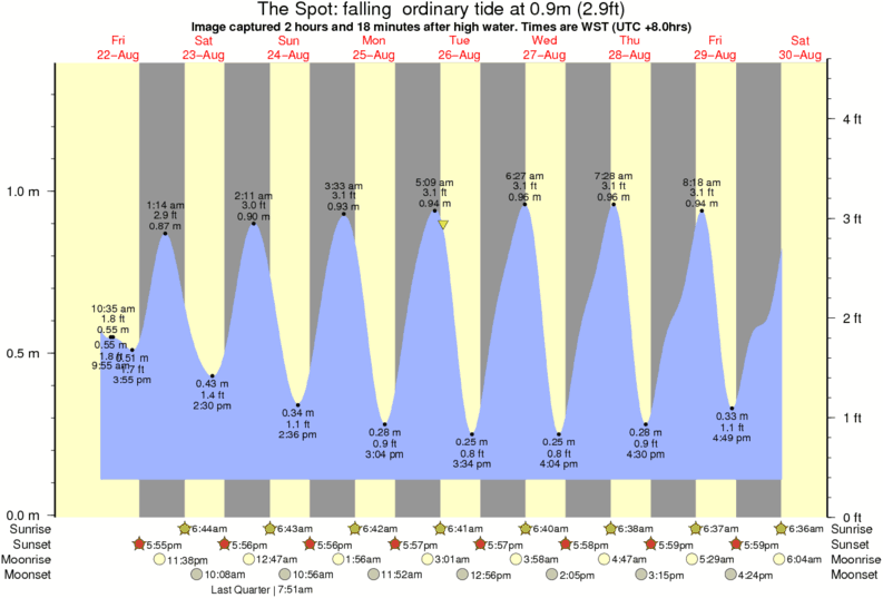 Image captured 2 hours and 18 minutes after high water (falling ordinary tide). Tide height was 0.9m (2.9 ft). Range 1.17m (3.8 ft). Toggle tide graph