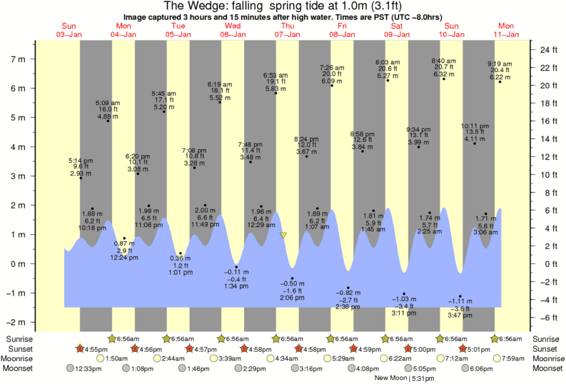 Image captured 3 hours and 15 minutes after high water (falling spring tide). Tide height was 1.0m (3.1 ft). Range 8.30m (27.2 ft). Toggle tide graph