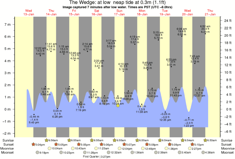 Image captured 7 minutes after low water (at low neap tide). Tide height was 0.3m (1.1 ft). Range 8.30m (27.2 ft). Toggle tide graph