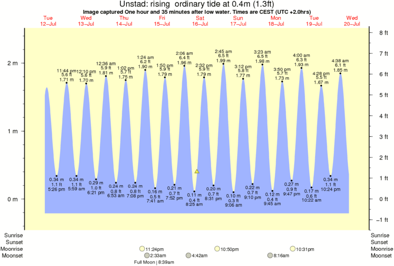 Image captured One hour and 35 minutes after low water (rising ordinary tide). Tide height was 0.4m (1.3 ft). Range 2.48m (8.1 ft). Toggle tide graph